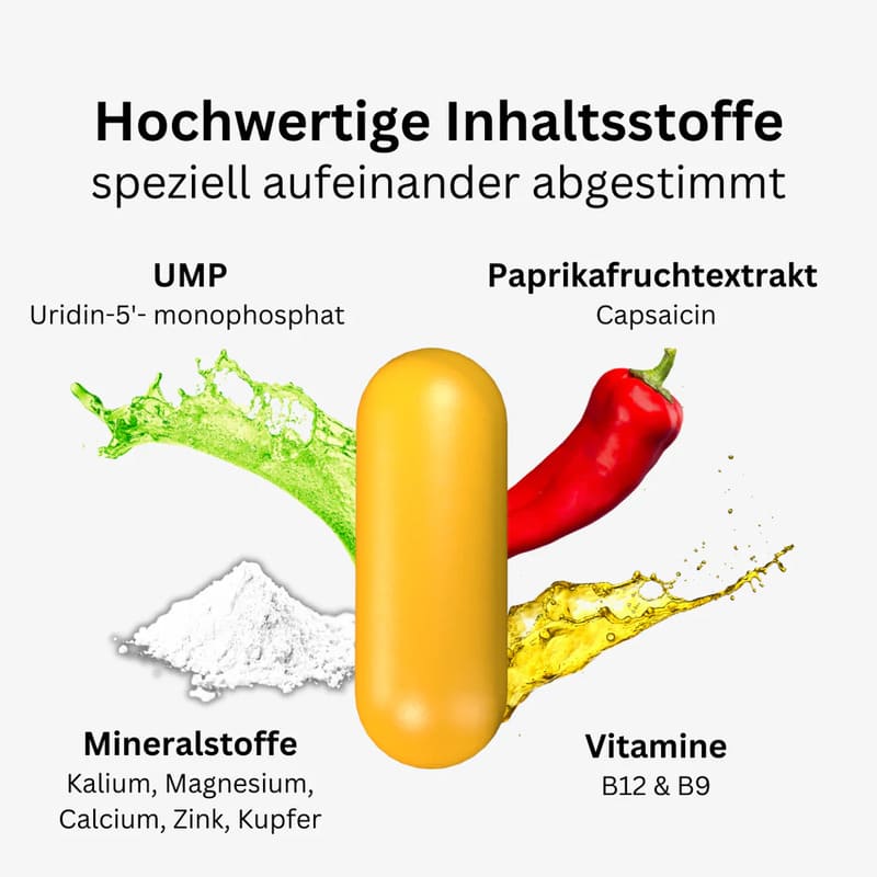 UMP, bioaktives B12, Folsäure, Magnesium, Zink, Kupfer, Kalium und Calcium liefern alles für die Nervenregeneration – belegt durch über 50 klinische Studien.
