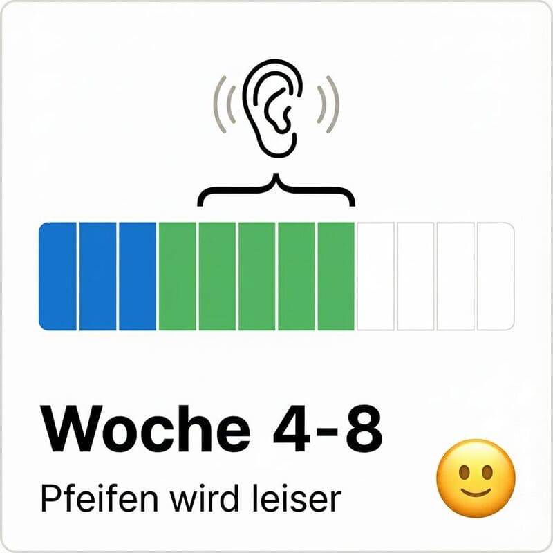- Woche 4–8: Pfeifen wird leiser oder "weicher"