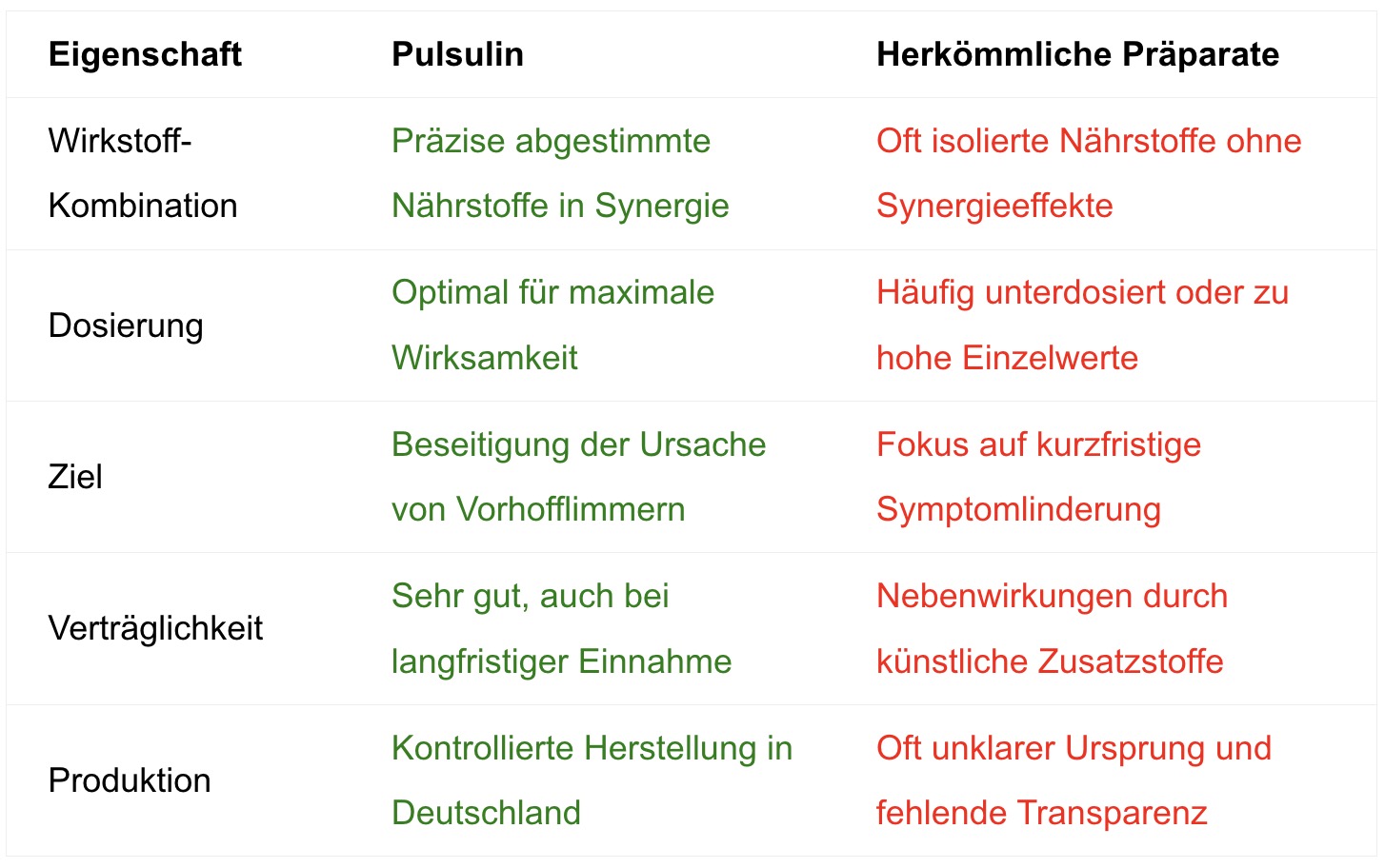 Pulsulin hebt sich durch die präzise Kombination und Dosierung essenzieller Nährstoffe von herkömmlichen Präparaten ab. Während einzelne Nährstoffe nur unzureichend dosiert oder isoliert angeboten werden, vereint Pulsulin sie in einem optimalen Verhältnis für das Herz.