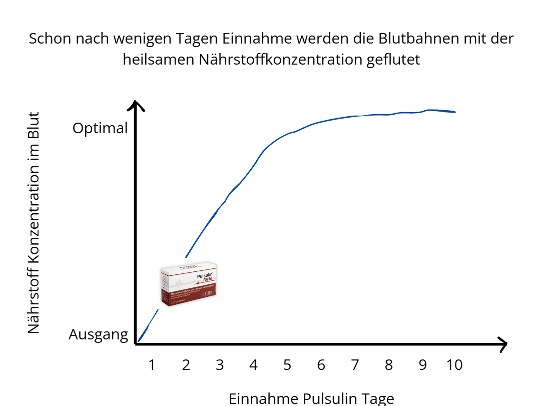 Pulsulin wirkt sofort, nachdem die Nährstoffe die Blutbahnen durchfluten. Zuerst stabilisiert es den Herzrhythmus und beruhigt das Herz. Magnesium, Kalium und Thiagen® reduzieren Symptome wie Herzstolpern, Hüpfen und Unruhe im Brustkorb. Das sorgt für eine spürbare Entlastung – sowohl körperlich als auch emotional.